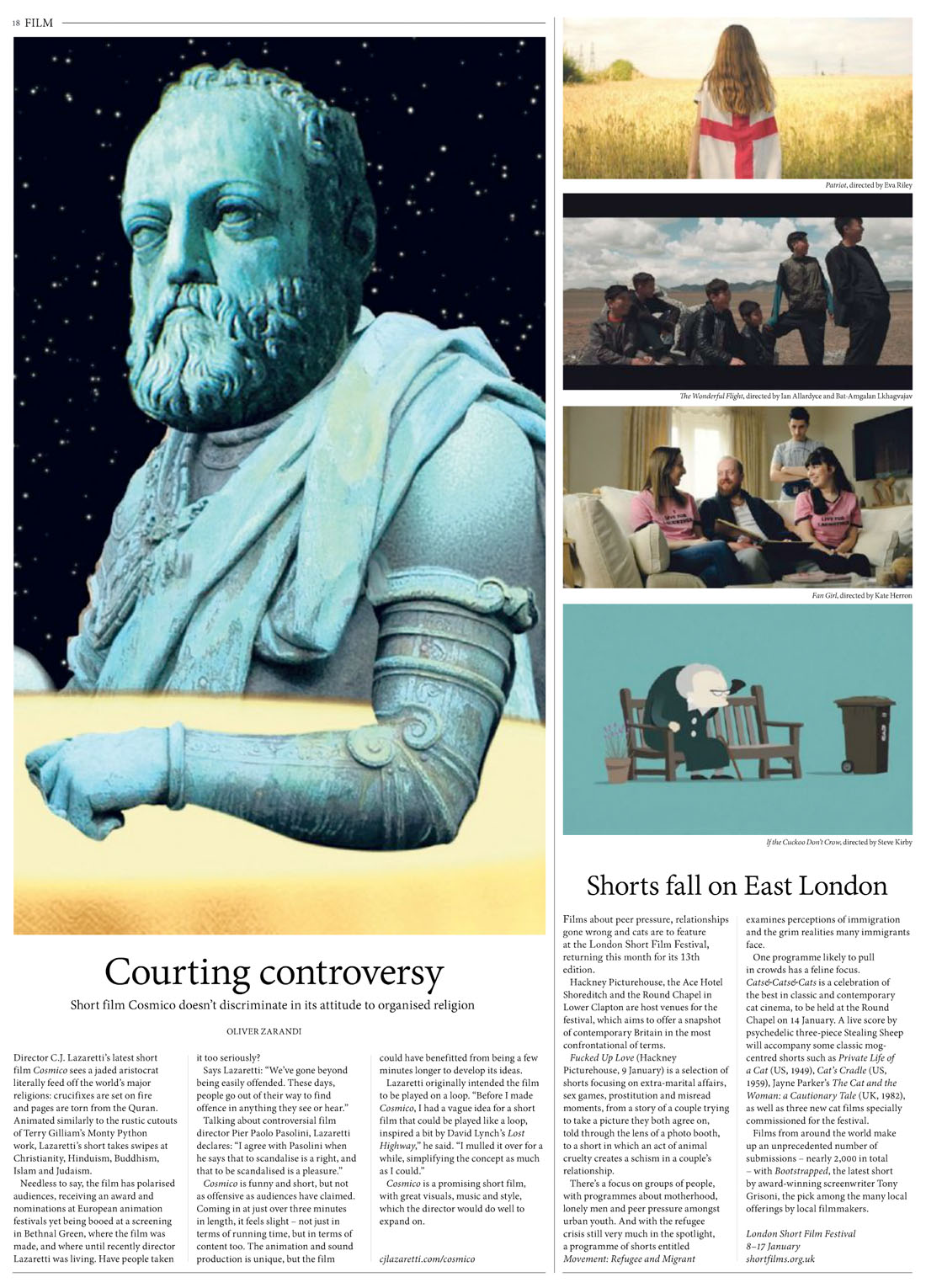 London newspaper Hackney Citizen dedicates more than half a page to their review of Cosmico. Film critic Oliver Zarandi interviewed director C.J. Lazaretti on the polarizing effect the short has had on audiences, discussing the right to shock and the movie's creative process in a concise article that is as informative as it is short. Pick up your free copy of issue 75 (January, 2016) and look for it on page 18, or check it out in the newspaper's digital edition
