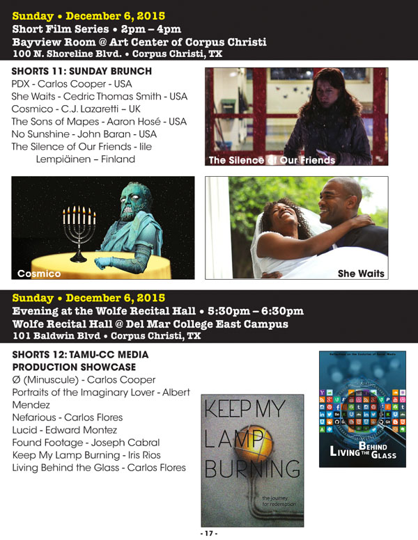 Winning the Spirit of STUFF award, the controversial religious satire of Lazaretti's short film blended in easily among other bold films. Many titles in the program experimented with unusual techniques and uncompromising artistic and social statements. Cosmico had its US premiere on Saturday, December 5th, with an additional screening on Sunday, at the beautifully restored Arts Center of Corpus Christi. Short film highlights over the weekend included the moving melancholic adult fairy tale of René Chandler's Dacryphilia, as well as John Baran's No Sunshine, a riveting crime film brimming with tension and dark comedy. Lazaretti joined several other directors for Q&A sessions with the public after both screenings.